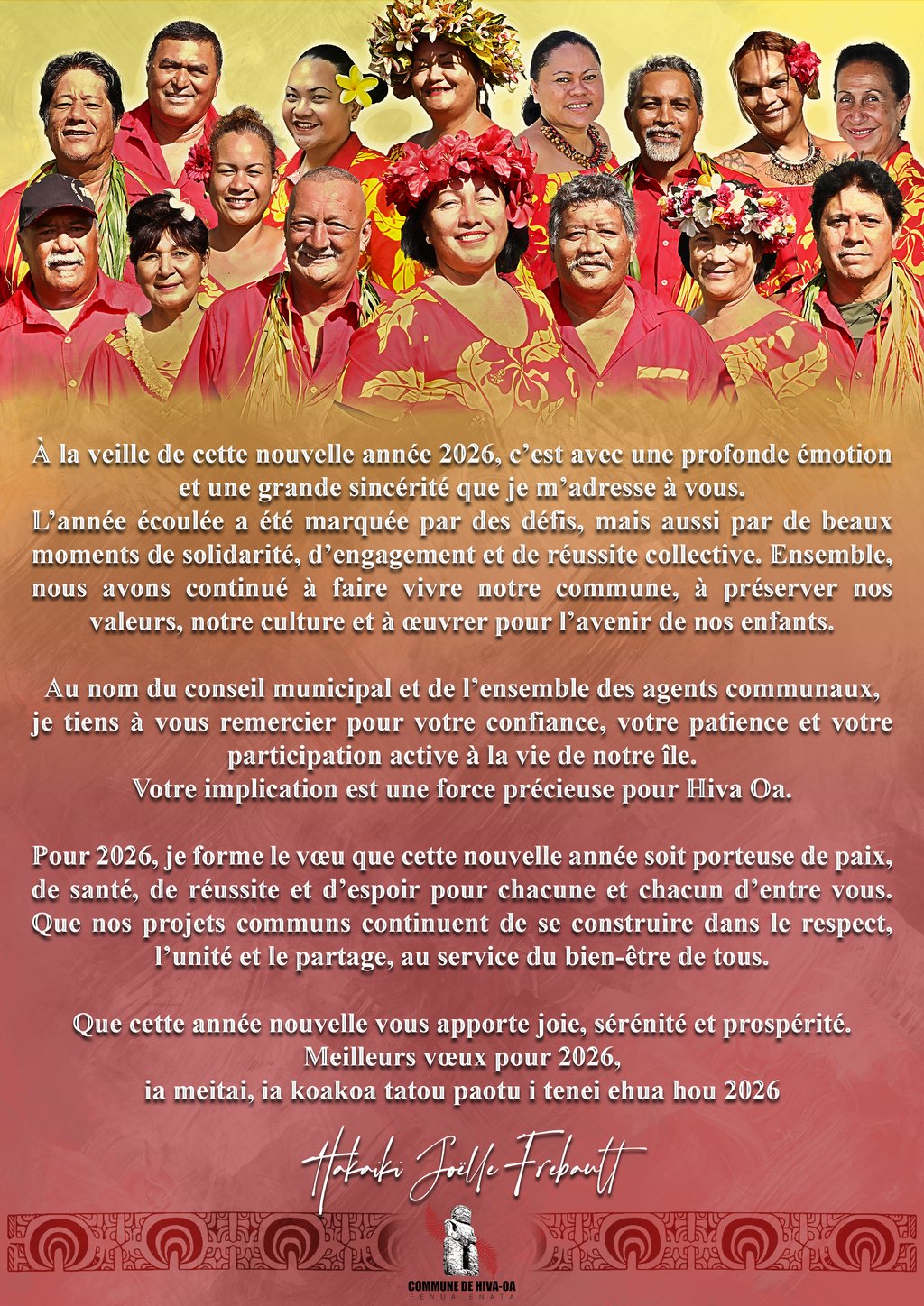 Au nom du conseil municipal et de l’ensemble des agents communaux, je tiens à vous remercier pour votre confiance, votre patience et votre participation active à la vie de notre île. Votre implication est une force précieuse pour Hiva Oa.